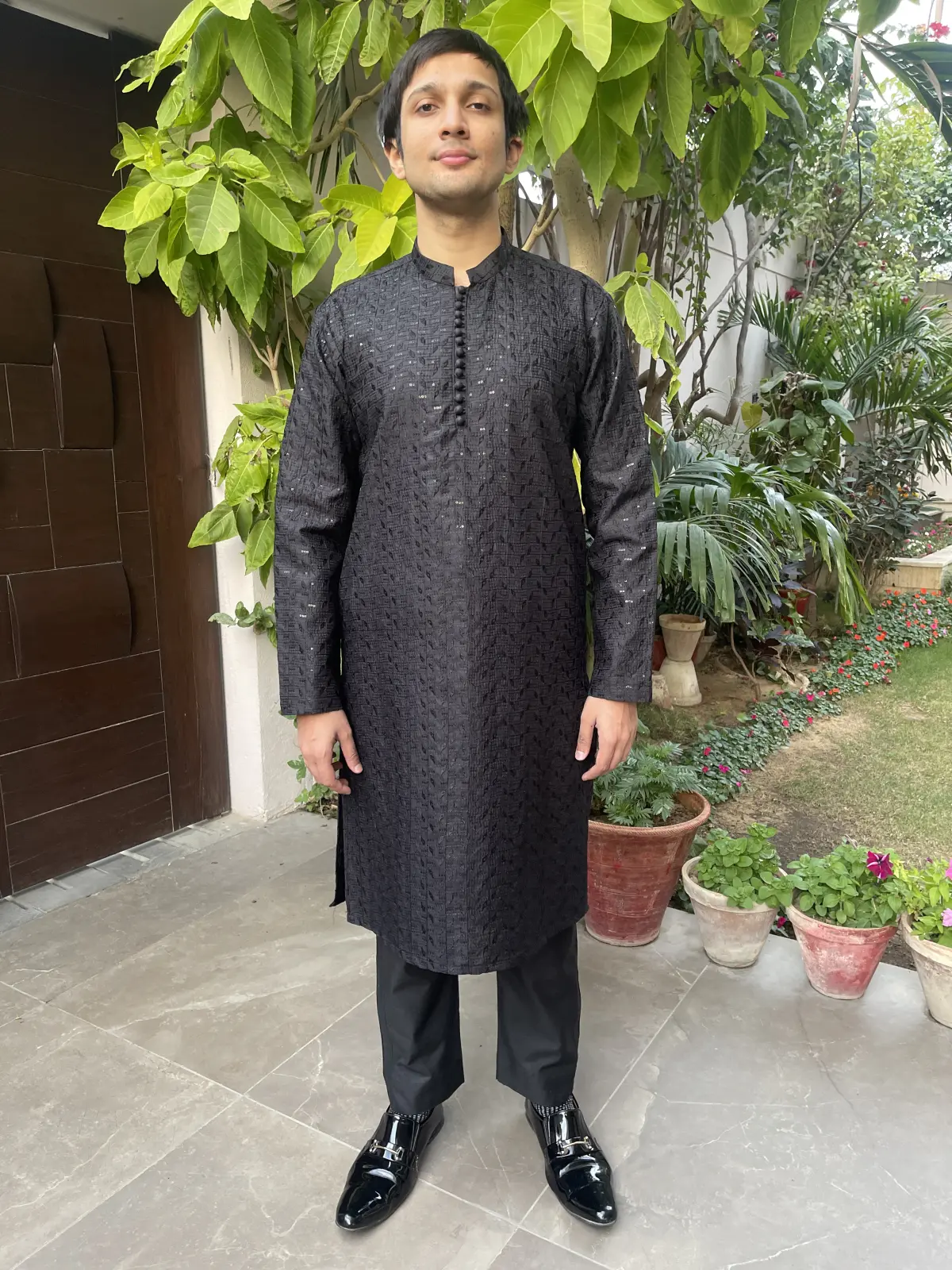 That is a sharp, sophisticated look. The monochrome black-on-black with subtle textures gives off an air of quiet confidence and modern tradition. Here is a luxury name and description tailored for this ensemble: Obsidian Midnight Chikankari Elevate your evening presence with the Obsidian Midnight, a masterclass in tonal depth and understated luxury. This isn't just a garment; it’s a statement of refined masculinity. The Fabric & Artistry: Crafted from premium matte-finish silk-cotton blend, the kurta features intricate, tonal Chikankari embroidery. The self-on-self patterns create a three-dimensional texture that reveals its complexity only as you move through the light. The Silhouette: A structured, slim-fit architectural cut designed to broaden the shoulders and taper cleanly at the waist. The high Mandarin collar is accented by a seamless row of hand-wrapped fabric buttons, adding a bespoke, artisanal touch. The Finish: Paired with tailored obsidian trousers in a crisp, breathable fabric, the look is anchored by high-shine patent loafers—blending classic South Asian heritage with contemporary high-fashion sensibilities. "For the man who understands that true elegance doesn't need to shout to be heard." Suggested Occasions * High-profile wedding receptions * Art gallery openings * Luxury festive dinners