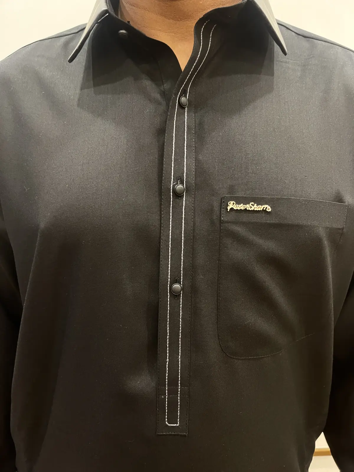 This ensemble is a refined take on the Shalwar Kameez, the traditional national dress of Pakistan, elevated with modern "luxe" tailoring and contemporary details. Design & Aesthetic Details The Silhouette: A classic long-line Kameez (tunic) featuring a curved hemline, paired with matching loose-fitting Shalwar (trousers). Fabric & Color: The outfit is crafted from a premium, deep-black fabric with a smooth, semi-matte finish that signifies formal quality. Contrast Accents: The Mandarin-style collar and extra-wide cuffs are finished in a contrasting, high-sheen material—likely leather or a high-gloss silk—giving the traditional garment a bold, modern edge. Ornate Detailing: * The front placket features distinctive white twin-needle topstitching that adds a sharp vertical line. Custom metallic hardware includes a silver-toned "PeterSham" brand logo on the chest pocket and matte black stud buttons along the placket and cuffs. Style Vibe This is a Modern Minimalist approach to luxury traditional wear. It trades heavy embroidery for structural details and high-contrast textures, making it ideal for evening formal events or festive occasions.